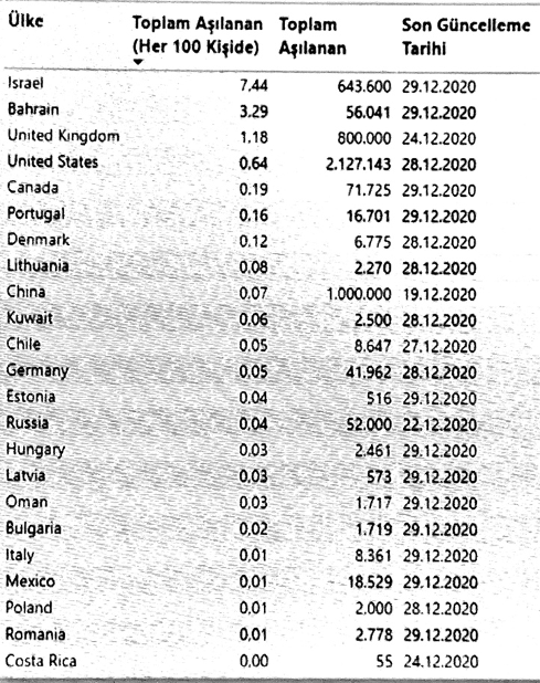 Tablo 2. Ülkelerin 29 aralık 2020 itibarı ile aşılanma yüzdesi