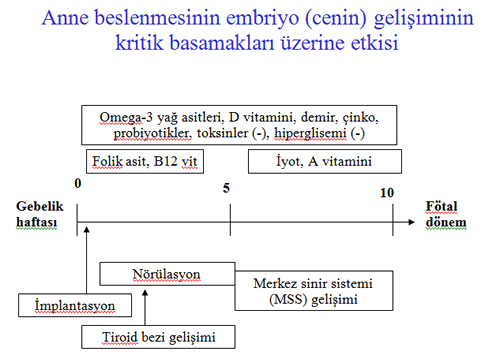 Aslında her doğal gıda fetüsün sağlıklı olarak gelişmesi için çok önemli. Ama yine de bunlar içinde bazıları çok spesifik. Folik asit, D vitamini (güneş), A vitamini, B12 viamini, omega-yağ asitleri, kolesterol, iyot, çinko ve probiyotikler bunların başında geliyor.