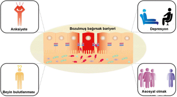 Bağırsaktaki bariyerin bozulması ve bağırsak geçirgenliğinin artışı bu gün otizm, dikkat eksikliği, hasas bağırsak sendromu, astım, multipl skleroz, depresyon, anskiyete, Parkinson, Alzheimer hastalığı gibi pek çok hastalığın temelin yer aldığı ileri sürülmektedir (şekil 2).