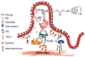 DQ2 gliadin’in, antijenik peptid parçasını bağlayarak bunu bağırsaktaki bağışıklıkla ilgili CD4+ T hücrelerine (lenfositlerine) sunar. Dendiritik hücrelerin değişime uğramış glüten peptidlerini tutması ve bağışıklık hücrelerini uyarması sonucu bağırsak mukozası tahribata uğrar ve bağırsak villüsleri körelir (Şekil 2). Mukozadaki plazma hücrelerinin sayısı artar. Sekretuvar IgA salgısı yükselir.