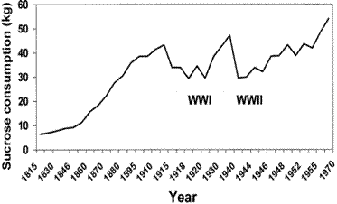 İngiltere’de 1815 de 5 kg civarında olan kişi başına yıllık çay şekeri tüketimi 1970de 50 kg’ın üzerine çıkmıştır. 1970-2000 yılları arasında ABD vatandaşları önceki yıllara oranla yılda 100 litre daha fazla şekerli meşrubat, 15 kg daha fazla tatlandırıcı madde ve 30 kg daha fazla unlu mamul tüketmişlerdir (U.S.D.A. Economic Research Service).