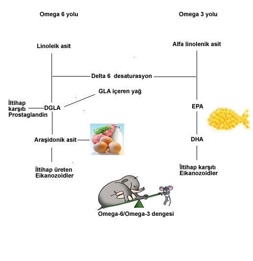 Linoleik asit (omega 6, LA) iltihap üreten maddelerin ön maddesi olan araşidonik asite dönüşür. Alfa linoleik asit (bitkisel omega 3, ALA) iltihap giderici maddelerin ön maddesi olan EPA ve DHA ya dönüşür (Şekil 1). Vücutta her iki yol tam bir denge içindedir. Tek bir enzim sistemi her iki yolda bu dönüşümleri sağlar. Dolayısı ile omega 6 ve omega 3 bu dönüşümler için yarış halindedir. Her iki yolda aşırı dönüşüm diye bir şey yoktur, dönüşümden sorumlu enzimler oluşan ürüne göre hız kısıtlayıcıdır. LA ve ALA kaynağının ancak % 1-5 i (araşidonik asit, EFA, DHA) dönüşür (1,2).