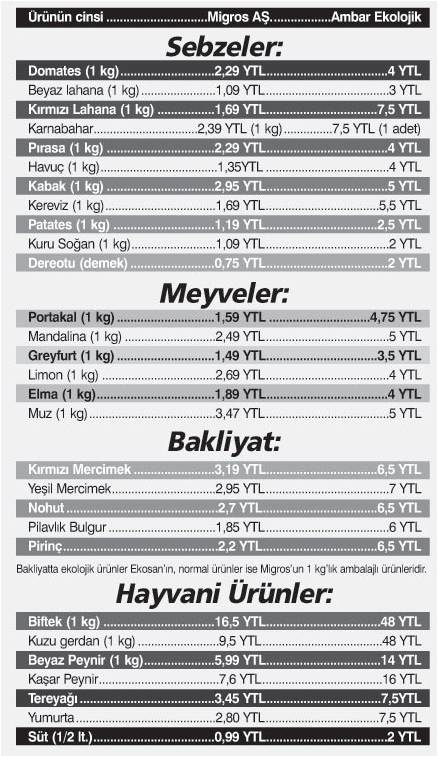 Aşağıdaki liste 19 Aralık 2007 tarihi itibariyle Migros AŞ’nin Internet sitesindendeki normal ürünlerin ve Ambar Ekolojik Ürün firmasının “nuhunambarı.com” adlı Internet sitesinden teşhir edilen organik ürünlerin fiyatlardır:
